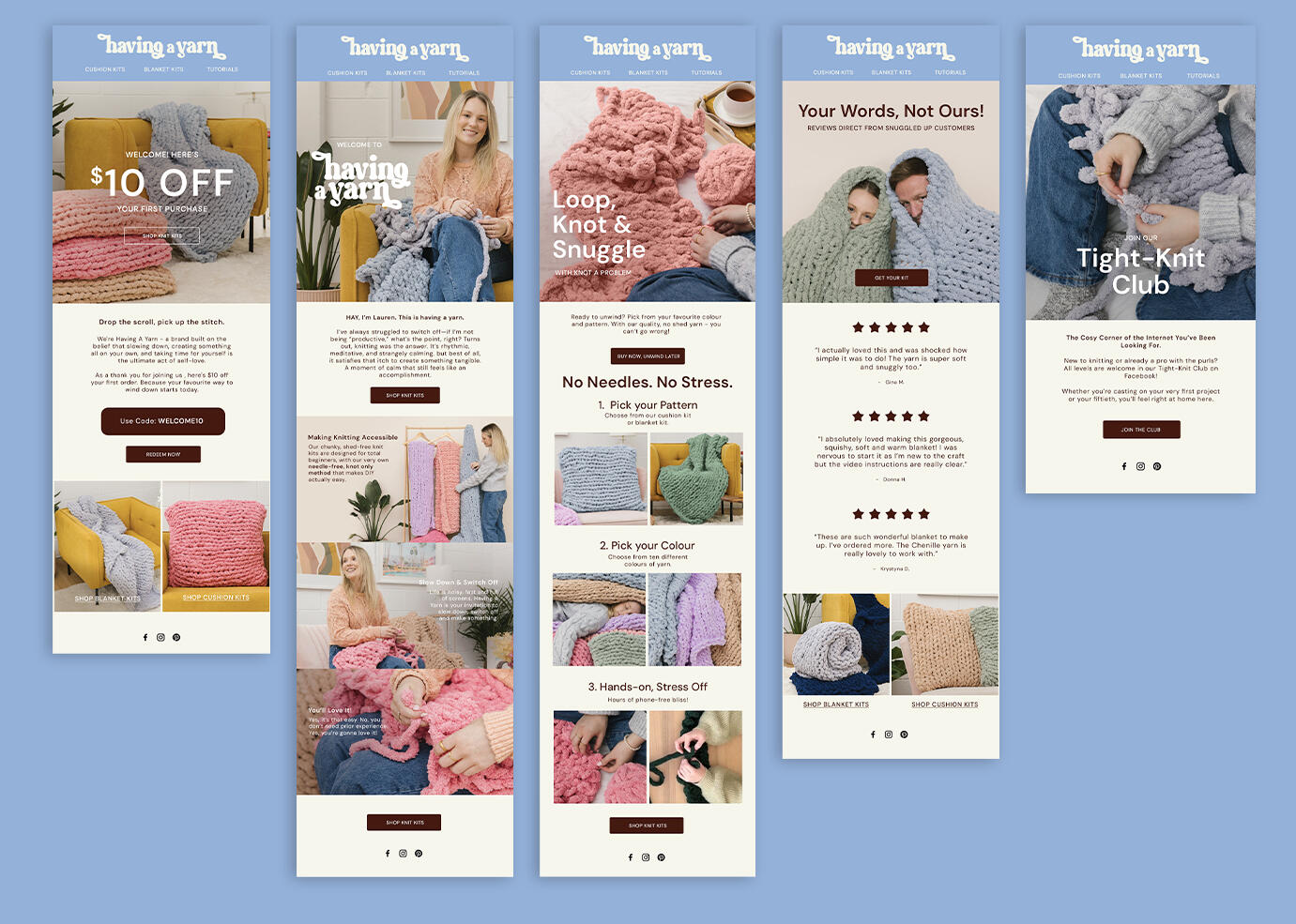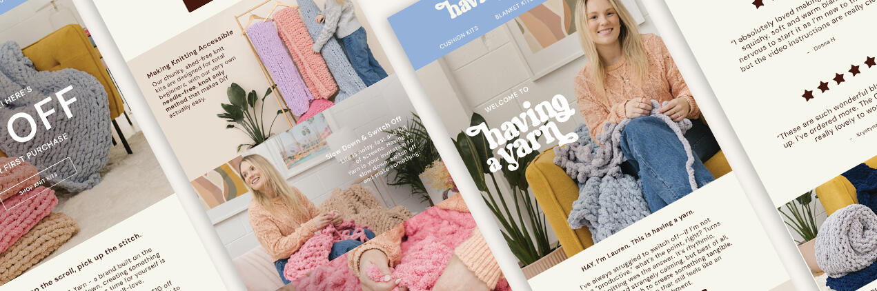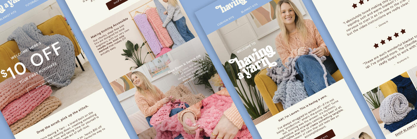 This speculative project showcases a strategic and visually engaging welcome flow, designed to onboard potential customers, introduce them to the brand story, and drive conversion.I developed the structure and strategy of each email, ensuring it is rooted in purpose - educating the user, building trust and prompting action. The initial designs are created in Photoshop, then rebuilt in Klaviyo using best email practices, including live text for accessibility, dark mode optimization and mobile responsiveness.Created for the brand Having a Yarn, this project demonstrates how design and strategic email marketing work together to create successful first impressions.