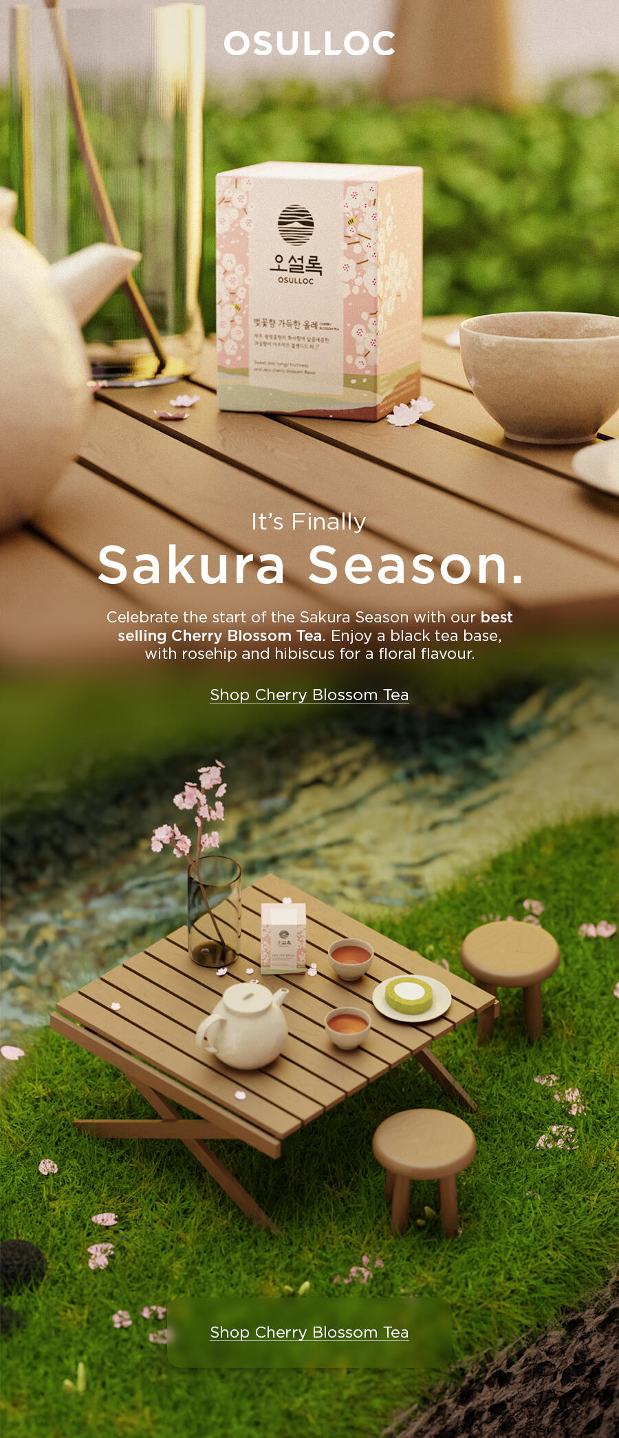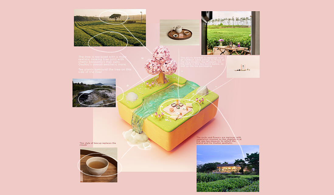 The team at Osulloc Tea Korea saw my viral tiktok 'Animal Crossing Spring Picnic' and reached out to me about reworking the project to promote their Cherry Blossom tea.The aim of the project was to use 3D techniques to create a scene resembling Osulloc's tea farm on Jeju Island during the spring time.This project combines my 3D motion package, and email campaign package.