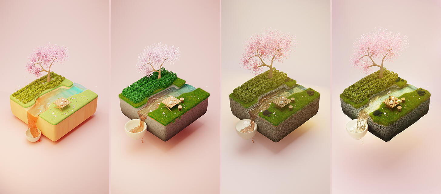 The most challenging parts of this project were the texture of the rock formation (aiming to match the volcanic rock texture naturally occuring on Jeju island), reaching the correct lighting and background colour & ensuring the tea colour was accurate to the colour of Osulloc's Cherry Blossom Tea.